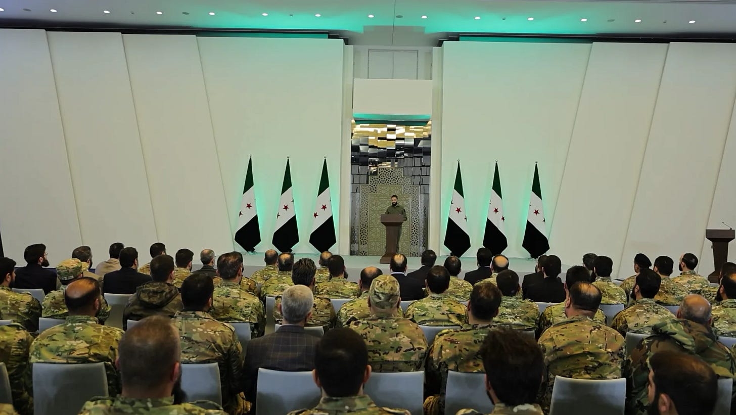 Convening the “Victory Conference” on January 29, 2025, which authorized Ahmed al-Sharaa as president, dissolved the Baath Party and former security apparatus, and launched the rebuilding of state institutions.