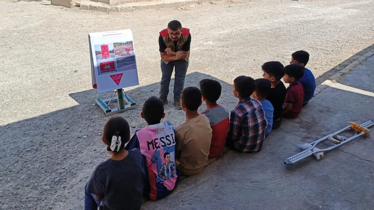MAG places strong emphasis on mine-risk education, delivering sessions to children and adults in schools, homes, and community centers, while also using digital campaigns to reach refugees and displaced people.