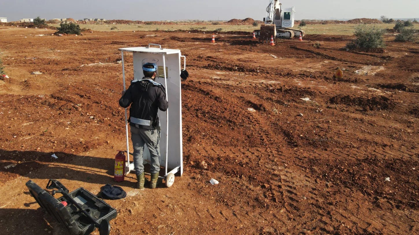 The primary burden of mine clearance falls on international and local organizations. The HALO Trust has operated in Syria since 2017 and currently employs 250 staff across wide areas from southern Idlib to northern Aleppo. The organization focuses on small-scale controlled detonations and reports that cluster munitions are the most commonly encountered explosives, alongside shells, rockets, and grenades.